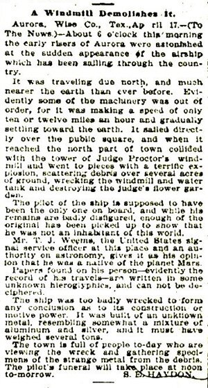 Details of the Aurora crash were published in the “Dallas Morning News” on April 19. Written by S.E. Haydon, the short account read that two days earlier, at 6 am, residents had seen an airship flying in a northerly direction over the town. It was flying very close to the ground and observers thought the craft was experiencing some type of mechanical problem. “It sailed gradually over the public square and when it reached the north part of town collided with the tower of Judge Proctor’s windmill and went to pieces with a terrific explosion, scattering debris over several acres of ground, wrecking the windmill and tower and destroying the judge’s flower garden.”