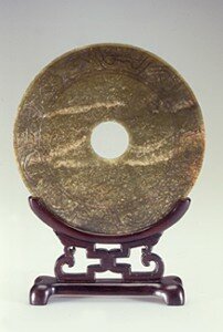 Bi discs were normally made from jade or other precious materials and were regarded as status symbols. In the aftermath of war, the losers were required to hand over their discs as a sign of submission. Furthermore, it is known that the discs were used in burials. In aristocratic burials, the discs were normally placed above the head, below the feet and on the chest of the deceased. Interestingly, Bi discs were often considered to be “the Ear of Heaven”, and sometimes the hole in the disc was placed in front of the mouth so that the dead could speak to their ancestors.