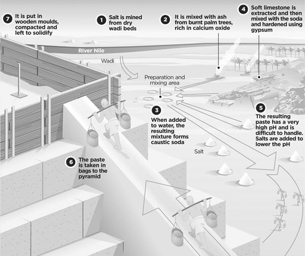 Caustic soda is the catalyst Imhotep needed to trigger off a powerful chemical reaction, one which would produce the fast integration of silica and alumina. According to Davidovits, they then mixed the ingredients in the canals until a homogenous binder paste was obtained. Imhotep had invented a water-based cement, which he had to convert into concrete. For this, he added more fossil shells, limestone rubble and silt from the river Nile, producing a concrete paste, which they carried to where hundreds of small wooden moulds had been prepared. These moulds had been smeared with rancid oil to facilitate the release of the concrete once hardened. The mixture was rammed into the moulds, becoming a dense re-agglomerated limestone, which was let to dry in the shade, to avoid its cracking under the glare of the hot sun.