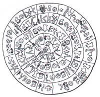 The Phaistos Disc was discovered in the basement of room XL-101 of the Minoan palace-site of Phaistos, near Hagia Triada, on the south coast of Crete. The Italian archaeologist Luigi Pernier recovered this remarkably intact dish, which is remarkably small, measuring about 15 cm in diameter and uniformly just over 1 cm thick. There is nothing remarkable about the disc itself: the inscriptions were made by pressing pre-formed hieroglyphic seals into the soft clay, in a clockwise sequence spiralling towards the disc’s centre. It was then baked at high temperature. The palace was possibly destroyed and abandoned when the Santorini volcano erupted – one of the biggest geological dramas that has upset the Mediterranean world in the past 10,000 years. If it had not been for the sudden and dramatic end of palace life, the disc may very well never have survived the millennia, until its discovery in 1908.